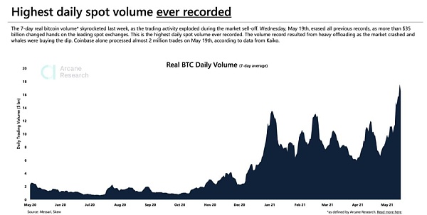雖然該事件是催化劑,但鏈上數據表明情況并非如此。Arcane Research的一份報告顯示,比特幣的每日現貨交易量在5月19日達到了歷史最高水平。