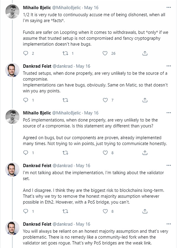 5 月 16 日,以太坊擴容解決方案 Polygon 的市值躋身加密貨幣市值前 20,隨后 StarkWare 的聯合創始人 Uri Kolodny 轉推祝賀,但同時他強調:“Polygon 是側鏈,而不是 Layer-2。L2 的安全性依賴于以太坊;而側鏈的安全性與以太坊的不相關 (甚至更低)。” 因此,社區圍繞 Polygon 到底是不是 L2 開始了激烈的討論。