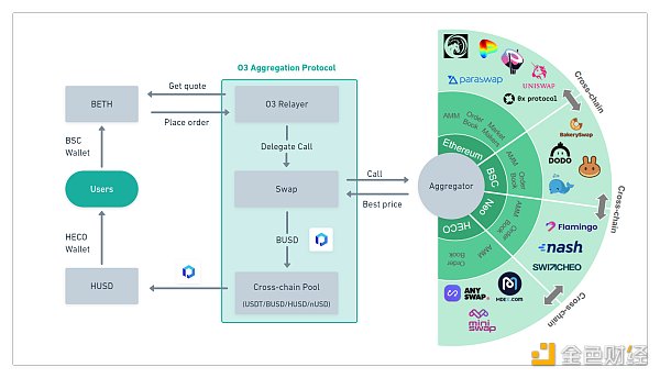 跨鏈聚合系統有各個區塊鏈上的O3 aggregators組成,幫用戶在對應的交易網絡中尋找最優質、有效的價格和交易路徑。