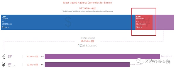 另外,根據 Coinhills 的數據,比特幣兌法幣交易占比中韓元的占比一直高居第二位,僅排在美元之后。