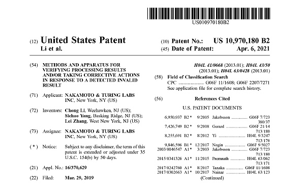 (驗證處理結果及針對檢測到無效結果采取糾正措施的方法和裝置)” (https://uspto.report/patent/grant/10,970,180) 獲美國專利局認證通過。此項專利通過概率論的工具和經濟學的模型,基于區塊鏈技術——“誠實性證明 Proof of Honesty(PoH)”的共識算法,為長期存在的計算機科學問題-可驗證的計算問題提供了解決方案,被邊緣計算社區視為全球首個有效應對可驗證計算問題的解決方案。是在共享經濟的時代浪潮下,實現全球計算資源共享的又一項重大技術突破。