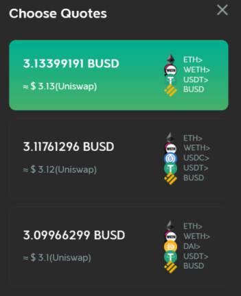 More Trading Price 根據流動性來源不同,提供了不同的兌換路徑選擇,系統將默認選擇最優路徑。下圖以 ETH 兌換 BUSD 為例,系統提供了三條路徑。