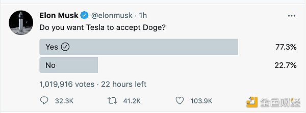 5月11日,狗狗幣教父(DogeFather)、特斯拉CEO埃隆·馬斯克在推特上發起一項投票:是否希望特斯拉接受以狗狗幣作為支付方式。今年稍早前,特斯拉已經宣布支持美國本土的客戶使用比特幣付款。
