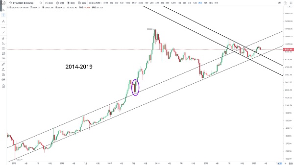 XRP/HKD-1.8%從BTC 2014-2020年長期走勢能看出,大方向上整體是向上攀升的,BTC大部分時間運行在一個上升通道內,每次觸及通道下邊線都是階段性底部蓄勢階段,隨后一段時間便出現一波趨勢性拉升行情,最近的兩次分別是前期3000-4000美元之間的探底,以及19年12月份再次下探至6400美元測試趨勢支撐,隨后便迎來19年4000-13900美元的小牛行情和今年開始一路拉升的強勢行情,多次回踩不破,表明該年線趨勢線的強支撐性,放大周期看,周線整體依然處于上行趨勢,整體走勢依舊穩健,每次向上突破趨勢通道,都能出現牛市的加速行情,例如17下半年的一路拉漲至接近20000美元歷史最高,以及19年的從突破點7000美元直線拉升至14000美元。