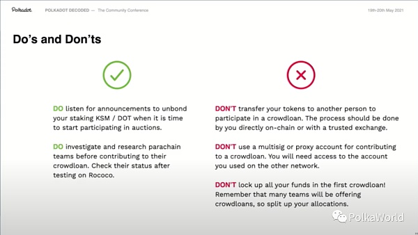 一定要好好調查和研究平行鏈團隊。因為眾貸是一個開放和無需任何許可的過程,所以你要知道可能會有一些有惡意意圖的團隊,可能不值得你為它去鎖定 KSM。我們之前在 Rococo 上進行了多輪平行鏈和眾貸測試,你可以去研究一下哪些團隊在 Rococo 測試網上是怎么做的。