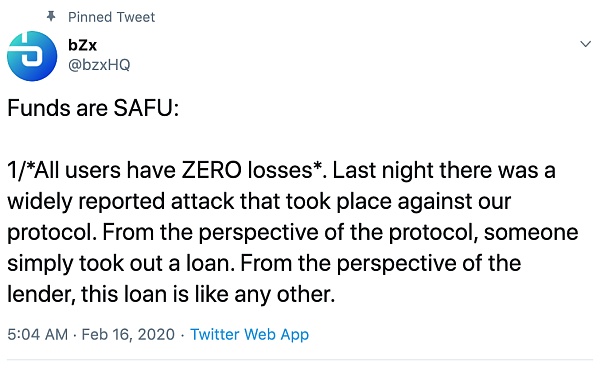 對于此次事件,bZx也做出了回應,bZx表示用戶損失為零,從協議角度看只是有人借了一筆貸款,從借款人角度看,和其他借款沒有什么區別。貸款者與其他貸款一樣要支付利息。實際上,它目前正在向貸出方支付很高的利率。只要它是永久借款人,對貸方來說就是一個很大的福音。