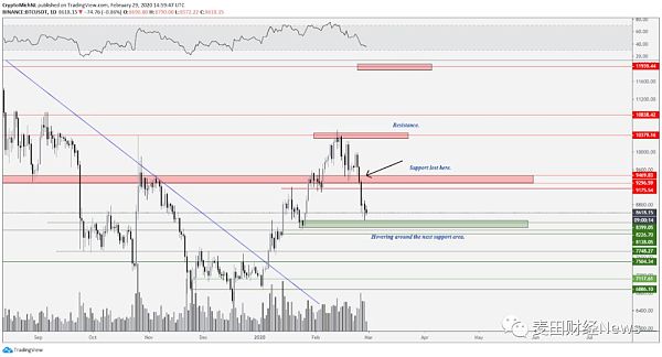 此前,比特幣價格在10400美元水平遇到了強勁的阻力,之后急需測試9400美元這一關鍵支撐位。但是,2月25日,比特幣跌破了9400美元,隨即引發了整個加密貨幣市場的大幅拋售。
