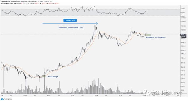 如果比特幣價格能夠在這一水平獲得支撐,可能意味著未來一段時間將上漲勢頭仍將延續。目前,21周均線大致位于8400美元左右。