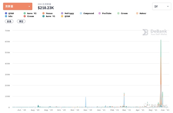 5月19日的清算量也創下了歷史記錄,單日清算6.1億美元。其中,BSC上的借貸平臺Venus創下2.5億美元的DeFi單日清算最高額,清算量占比40.79%。其它主要抵押借貸平臺中,Aave V2清算量為1.57億美元,Compound清算量為1.3億美元,Maker清算量為0.42億美元。