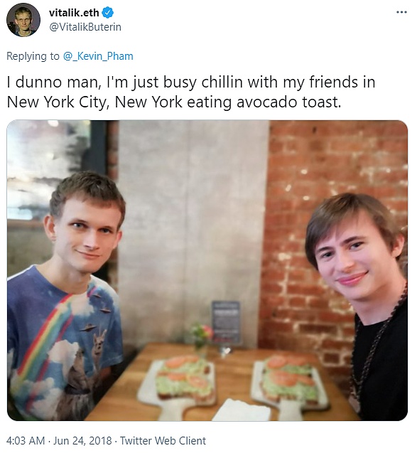 這是一張 Vitalik 吃牛油果吐司的照片,他穿著一件上面有小貓和彩虹的T恤。這很好地說明了這一切。