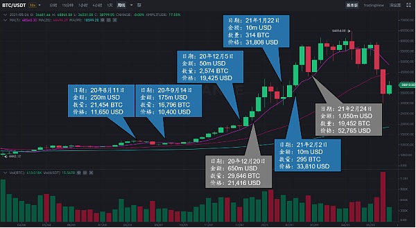MicroStrategy于去年8月11日首次披露使用公司自有現金購買并持有比特幣,此后連續追加4次投資,累計使用自有資金5億美元,購買比特幣41,433枚,平均持倉成本11,947美元。此后于去年12月20日和今年2月24日分別發行可轉債融資,總計融資17億美元,購買比特幣48,868枚,平均持倉成本34,788美元。