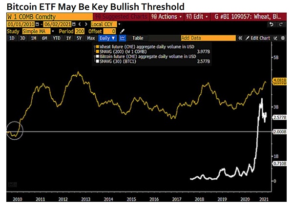 圖表顯示,加密期貨的 30 天平均交易量為 26 億美元,而小麥期貨的 200 天平均交易量在大約十年內穩定在 40 億美元以下。幾乎沒有什么可以阻止每日比特幣期貨交易量的美元價值超過小麥。