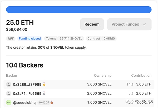 例如,一位名叫Emily Segal的作家能夠為她的下一部小說眾籌5萬美元(25 ETH),以$novel代幣的形式分發70%的作品,這代表了NFT的部分所有權。在此書的致謝中有提到,如果NFT在二級市場上以更高的價格出售,104美元的NOVEL代幣持有者有權按比例分享利潤以及其他好處。