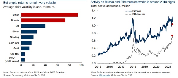 加密資產和其它資產的平均每日波動率 ? ?比特幣和以太坊網絡總活躍地址數達2018年高點