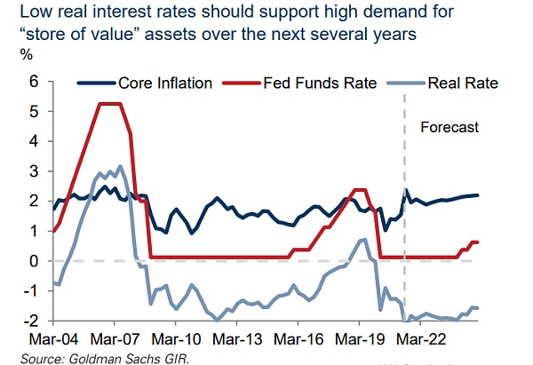 撇開技術問題不談,當前的宏觀經濟前景似乎有利于存儲價值資產,無論是實物還是數字資產。美聯儲采取了更加雄心勃勃的勞動力市場目標,即“廣泛而包容的”充分就業,并且似乎比最近更能容忍高于目標的通脹。我們的經濟學家預計,未來幾年,發達市場經濟體的實際現金收益率將保持為負。股市倍數處于歷史高位。許多發展中國家將在未來幾年內努力應對 COVID-19危機帶來的財政后遺癥。在這種環境下,除非投資者能夠找到其他實際回報來源,否則對保護購買力的資產的需求應該會保持在高位。?