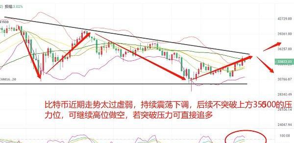 XRP/HKD-0.74%比特幣自從突破上方42000失敗后,整體呈現震蕩下跌趨勢,短線上若能突破上方壓力35000即可迎來一波強勢反彈,若受阻下調則會迎來再一輪的調整。