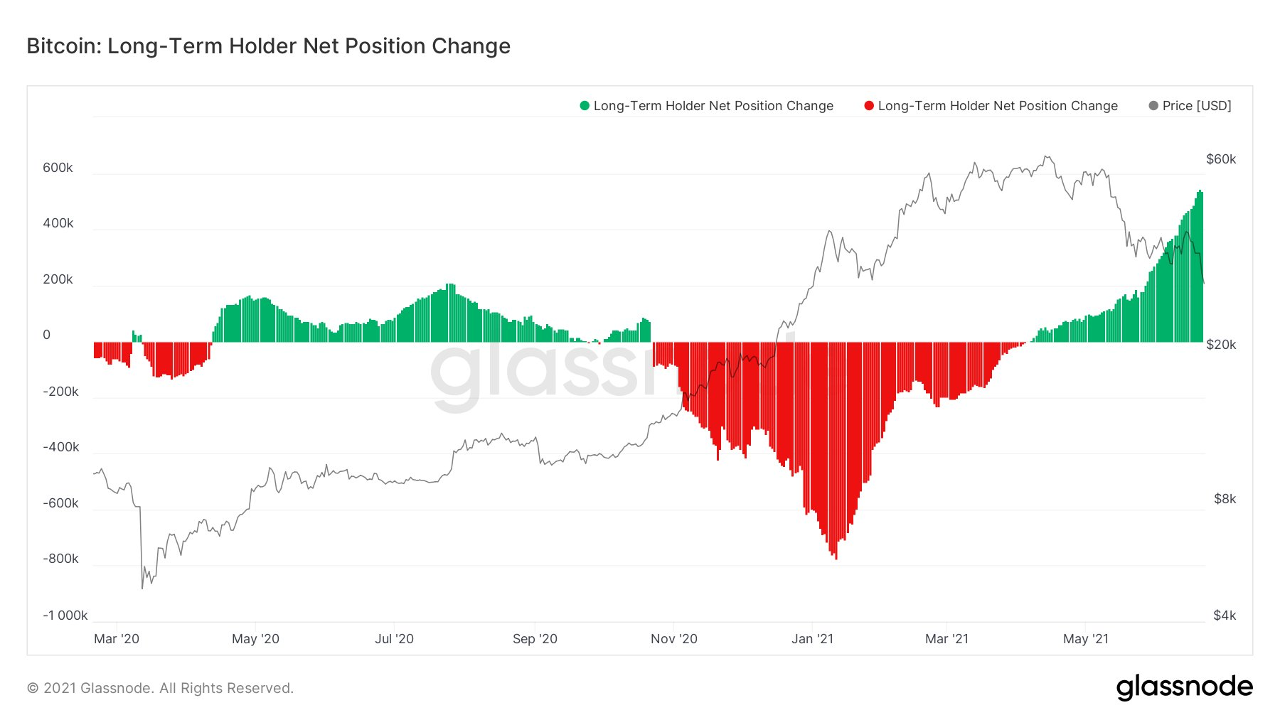 比特幣長期凈持有者頭寸顯示,投資者實際上早在4月下旬就開始重新增持,并且隨著價格跌至3萬美元至4萬美元。到了5月,他們開始明顯增加其活動。鏈上數據顯示,這些投資者繼續在最近的跌勢中繼續買入。