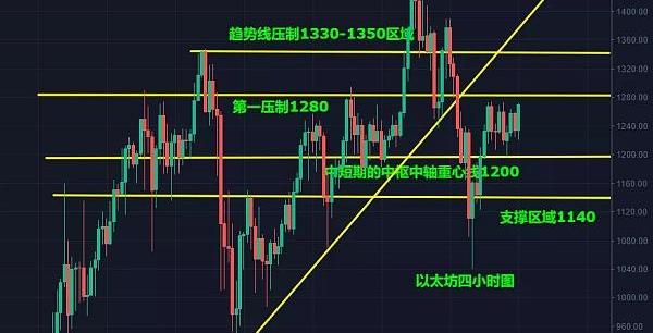 ??ETH這一輪上漲,頂部量能換手較小,說明大家的預期仍然沒有達到,ETH未來的預期仍然值得期待,目前的位置1200左右會成為中短期的中樞中軸重心線。目前來看,以太坊小時線及4小時級別,壓力位均此前趨勢線壓制1330-1350區域,而下方支撐也是此前多次回撤停留區域1140一線,今日短線操作上建議反彈1330-1350區域布局空單,目標看1280-1200,持續下破留部分倉位看至1180-1140區域。短線圍繞支撐和壓制做好合約波段利潤還是相當可觀的,注意做好倉位規劃和止損止盈設置。