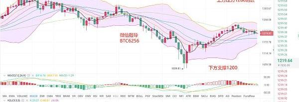 短周期小時圖看,布林帶呈開口向上狀態,MA5日均線在上方壓制,行情在窄幅震蕩,如若幣價若能突破這一壓制區間,那么行情可能會繼續上行,反正如果未能突破這一壓力,那么行情可能還是有承壓走低的風險。上方壓力在1260,下方支撐在1200,建議高空低多的思路操作。