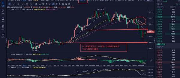 以太坊:晚間上方關注1320附近的承壓,下方支撐1230附近,壓力和支撐允許5-10個點誤差。