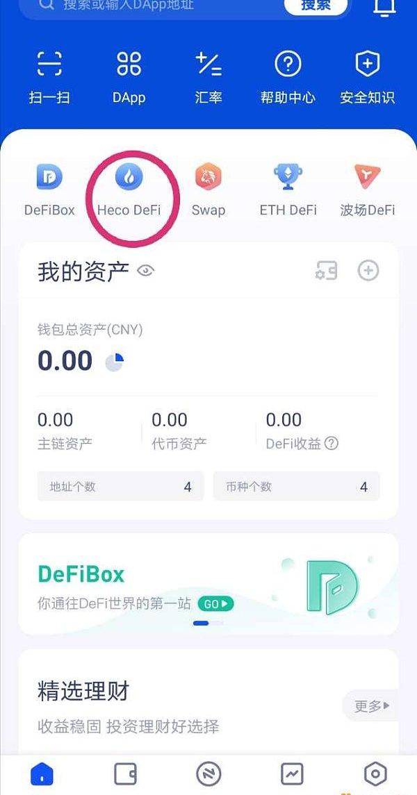 3.火幣錢包內,選擇“Heco?Defi”,“DEX”,“MDEX”即可開啟挖礦。