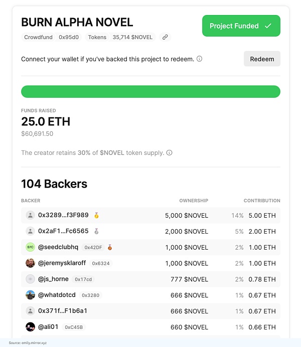 由于加密網絡上的所有交易都在鏈上結算,我們將能夠將豐富的經濟關系構建到社交應用程序、在線社區和市場中。我們將為創作者、社區和各種創意項目提供加密原生版本的 Crunchbase。在Mirror,我們展示了代幣化眾籌的這些經濟關系,這些眾籌支持小說、時事通訊和創作者駐留等創意項目。