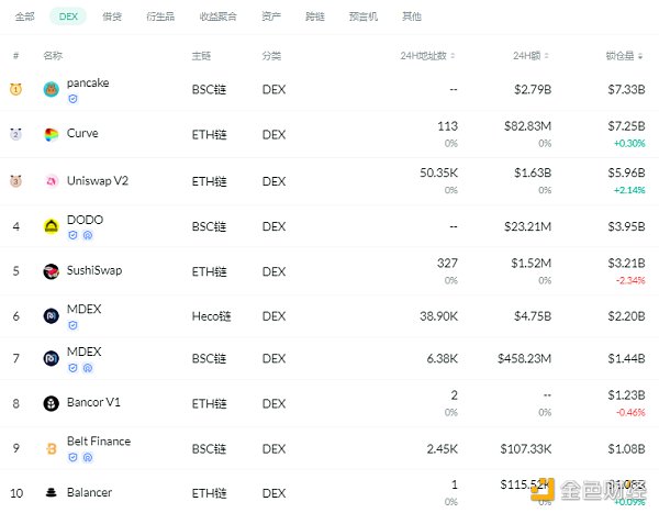 交易量排名前十的DEX 排名來源:DeFibox