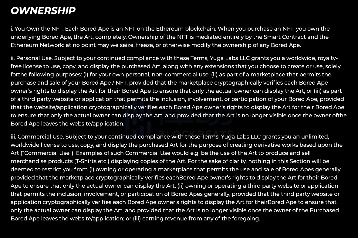 這是因為 Bored Ape Yacht Club 將版權中的著作財產權授予給了 NFT 數字作品持有者,這一點在項目官網的條款細則中有詳細的解釋。不過持有者只擁有自己持有的那一只猿猴數字作品的著作財產權,使用其他猿猴需要得到其他持有者的授權。