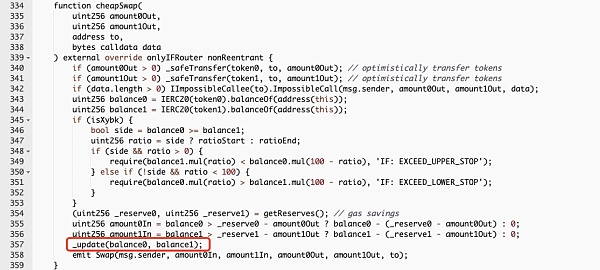 但通過分析 Impossible Pair 的 swap 函數與 cheapSwap 函數的具體邏輯,我們發現一個驚人的情況:在 swap 函數中進行了 K 值檢查,而在 cheapSwap 函數卻未進行 K 值檢查而直接進行了 update 操作。這就導致了攻擊者進行了多次兌換操作獲得了額外的 BUSD。