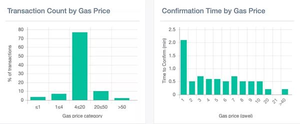 在右邊的統計圖中,我們可以看到,如果給的 Gas 單價是 4Gwei,打包交易需要的平均等待時間是 0.6 分鐘;如果是 20Gwei,平均等待時間是 0.2 分鐘。