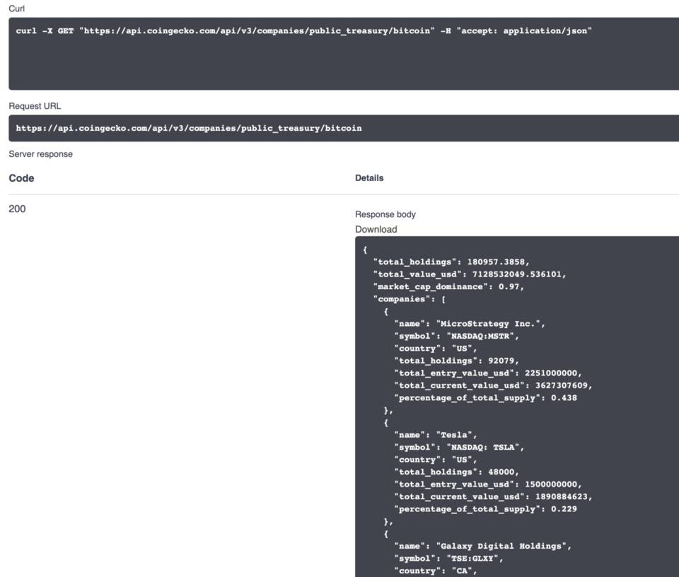 如果你也會寫程序,在日復一日的 CRUD 工作中,一定會和大量的 JSON、XML 文件的交互,這一類文件提供了必要的 metadata 信息,當然如果你不會寫程序也不要緊,這里以 CoinGecko 提供的 API 為例,這個案例中我們請求了 Bitcoin 的 Public Treasury 信息,返回的字段中有 total_holdings, total_value_usd, market_cap_dominance, companies 等信息,例如在 companies 中還可以進一步嵌套 name, symbol, country 等其他信息。