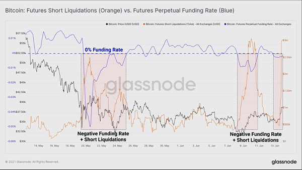 在過去幾個月的盤整中,每次資金利率(藍色)變成負值,價格就會反彈,越來越多的空頭被清算(橙色)。