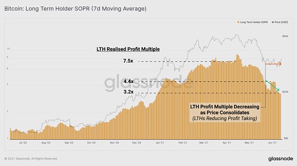 在3-4月達到約7.5倍(LTHs實現750%的利潤)的峰值后,可以看到LTHs在這次價格調整中實現的利潤在下降,甚至在價格橫向交易時也是如此。LTHs目前實現的利潤倍數為3.2倍,這表明他們賣出的加密貨幣的總成本基礎約為1.1萬美元