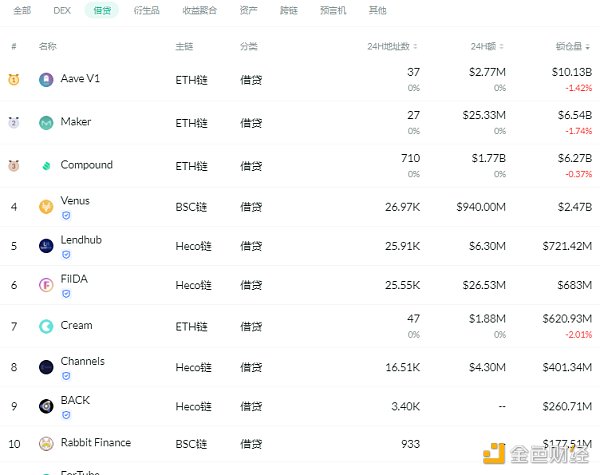 鎖倉量排名前十的借貸平臺 排名來源:DeFibox