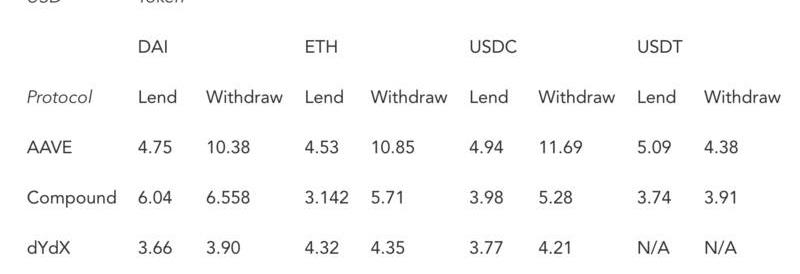 協議dYdX在所有資產的借出和提款中均以最低的交易價格脫穎而出。對于借出ETH,Compound上的交易價格大致相同,而AAVE的所有資產的提幣成本均明顯更高。?
