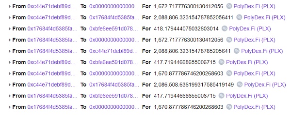 攻擊者首先使用PolyDex的WMATIC和WETH池進行PLX借貸,如下圖所示: