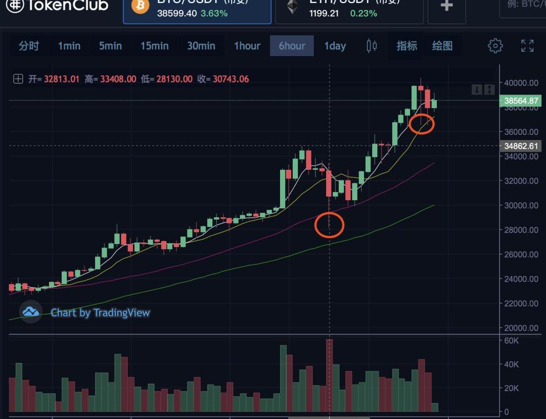 BTC:從4小時線來看,每一次插針爆多,都是為了更好的上漲。既然已經摸了下4萬美元,在震蕩上行的過程突破是大概率,由于已經經歷了一次爆多,再次突破大概率不會再有回踩行情,很可能在突破4萬之后再出現單日上漲5個點以上的行情。針對倉位還可以的朋友,可以拿一些小倉位高賣低買,只要確保做飛了也無所謂就可以,而還想加倉的朋友,現貨幾千點的差別已經不大,關鍵在對大牛市高點的預期。