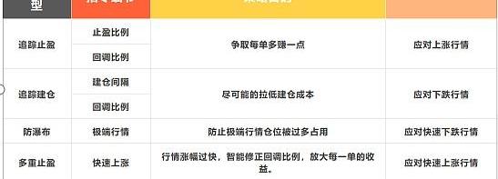 追蹤止盈,當行情開始上漲時,比如當前幣價100,漲到103時,漲幅3%,這時小鼎機器人開始監控追蹤行情變化。?第一種情況,繼續上漲,比如漲到了110,漲幅10%的是時候,開始回調,回調到1%,這時幣價在109。小鼎量化機器人就在109處賣出,獲利9%。第二種情況就是,剛一漲到103,幣價就開始回調了1%,這時幣價102.那么小鼎就在102處賣出,這樣保證獲利2%。第三種情況,就是震蕩橫盤,那么小鼎量化機器人就會一直監控,知道出現前兩種情況開始監控賣出。