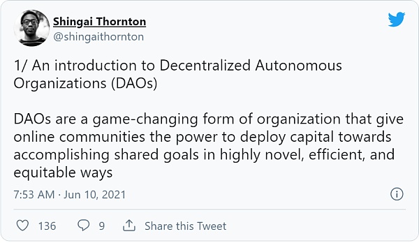 就像DeFi是可編程的貨幣,NFT是可編程的媒體一樣,DAO是可編程的人的組織。