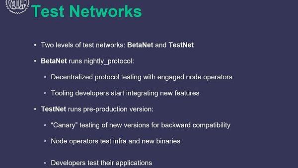 之后,一龍對網絡測試進行了分享。NEAR的測試網分為兩個級別,分別是betanet和testnet,前者運行nightly_protocol,由專門的節點運營商進行去中心化協議測試,工具開發者也開始在此期間集成新的功能。后者則運行預先生產的協議版本,開發者會對新版本進行“金絲雀測試”,確保其向后兼容,節點運營商對基礎設施和二進制進行測試,開發者則對其開發的應用進行測試。