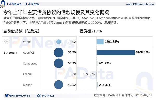 上半年5個主要借貸市場的借貸規模平均(中位數)增長了293.36%,其中,AAVE V2(以太坊)和Venus的借貸規模增速超過1000%,尤其是AAVE V2(以太坊),上半年的借貸規模翻了82倍,發展尤為迅猛。值得關注的是,AAVE的閃電貸業務發展良好,根據Aavewatch的監測,截至6月30日,AAVE V2閃電貸借貸規模約為40.72億美元,約占總借貸規模的73.11%,上半年的增幅達到130.58%。另外,Compound和Maker的借貸規模增速也都在200%以上。