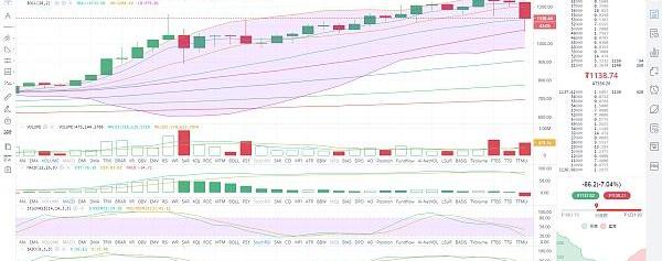 ????????小時線看,早間比價上探布林帶上軌附近后回落,一路下行最低給到120日均線附近后獲得支撐小幅反彈。附圖指標中,MACD快慢線在0軸上方拐頭向下發散,紅色量柱持續放量,StochRSI指標在超賣區拐頭粘合,SKDJ指標拐頭向下發散。