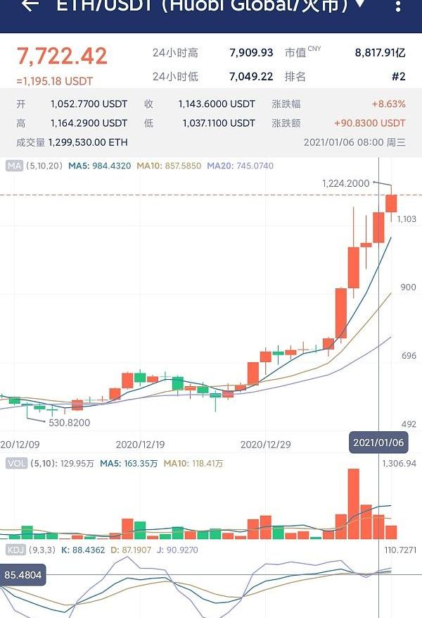 2021年1月6日以太坊漲幅8.63%,收盤價1143.6美元,1月7日價格運行于三條均線之上。