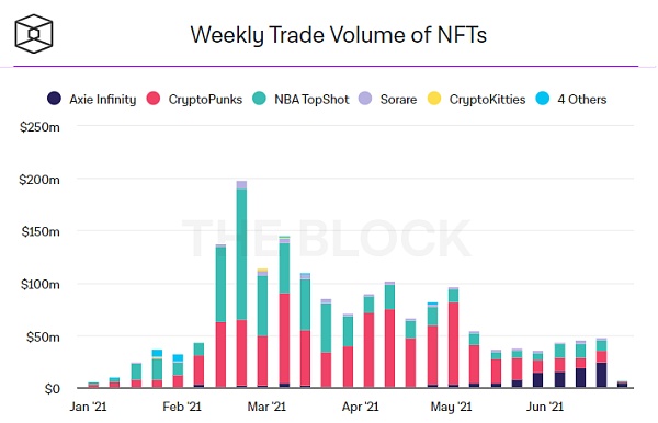 根據 TheBlock 的數據統計,2021年上半年 NFT 主流市場的周交易量一路穩定增長,在2~3月份周交易量達到了高峰值近 2 億美元,Beeple 的 NFT 作品《Everyday》就是在 3 月 11 日以 6930 萬美元的價格售出的;隨后 NFT 市場從狂熱中逐漸恢復理性,再加上后面幣圈市場行情的冷淡,NFT 的周交易量有所回撤,但目前也穩定在 4000 萬美元左右。