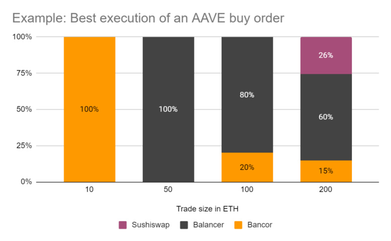 表5:用 ETH 買入 10 個 (3200 美元)、50 個 (1.6 萬美元)、100 個(3.2 萬美元) 和 200 個 (6.4 萬美元) AAVE 的最佳策略。交易規模越大,交易路徑就會包含越多交易所,避免對單個流動性池造成過大的影響。來源: 1inch