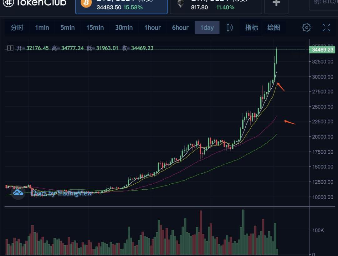 都說2021年會是4年一次的超級大牛市,元旦假期最后一天,大盤再度暴漲,開了個好頭。大餅單日漲幅15個點,以太坊也順利站上第一目標價800美元,和大餅的走勢一樣,如果這波再沖上去,800以下的以太坊就很難再見到了。至于比特幣,已經在我們給定的目標區間3-4萬美金運行,過去的大半年,無論你什么時候上車,只要按照思路:控制好倉位,中長線現貨別下車。都有數倍的收益。今天#比特幣突破3.2萬美元#再上新聞熱搜,無論是3萬美金或者20萬人民幣,這一波突破沒有給二次上車的機會。在這波上漲過程,有人注意到coinbase上的比特幣價格相對國內幾家交易所一直有幾百美元的溢價,由此推測這波強力拉升,還是國外的資金為主力,尤其機構對這輪超級牛市的貢獻很大。有趣的是,今天輿論的焦點是比特幣市值突破6300億美元,超越阿里巴巴市值。比特幣作為傳統金融圈外的產物,甚至很長一段時間被視為怪物般的存在,如今市值居然排進了前十。盡管比特幣不是一家公司,其總市值的目標也絕非單一公司,但是在超越阿里巴巴、特斯拉乃至蘋果的這個過程,肯定會讓不少傲嬌的金融大佬刮目相看。朋友近期的感悟:之前那些無限貶低比特幣的朋友,在不斷看到上漲新高的新聞之后,口風也開始改變了。比特幣不需要得到每個人的認可,其價值也不依賴價格顯現,現在怎么樣,未來還會是怎么樣。關于價格的判斷,由于比特幣已經到了第一目標區間,從投資的角度來說,這個價位就不應該大規模投入了,并不是看跌,而是因為再往上走,風險肯定是越來越大。比特幣是信仰,投資是為了更好的生活,如果你空倉而擔心價格飛上天,那任何價格買進一點都可以。如果本身有倉位,盡可能去拿住,但同時要注意分批止盈,沒人可以賣在最高點,賣之前想清楚賣飛了是不是也沒關系。還有最重要的一點,無論如何不要清倉,底倉是你在市場的心態保障。行情方面: