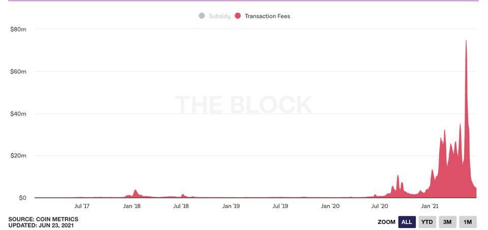 以太坊每日交易費用 (7 日平均值) (來源 : The Block)