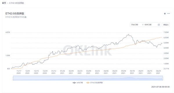 近兩個月來,有越來越多的ETH被質押到信標鏈上,在價格下跌期間,新增質押數反而出現了明顯上升。目前,信標鏈上質押的ETH總量已經超過了600萬枚,幣本位年化為6.3%。