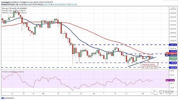 相反,如果價格從當前水平或上方阻力位轉為下跌,并跌破趨勢線,比特幣可能跌至31000美元。這是一個需要注意的重要價位,因為空頭可能無法收盤在此價格之下。
