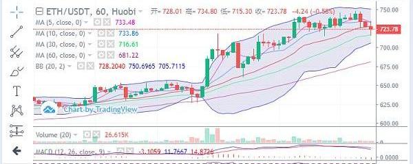 以太坊延續上行之勢,日內凌晨行情是沖高回調,昨日壓制區域再度被打破。目前高位上移至750一線位置,行情雖然出現十多點回調,但是上行趨勢并未改變,且下方支撐在緩慢上移,整體多頭情緒較為濃重,日內若是價格突破750關口,上行走勢還將延續。日內操作順趨勢多單即可。下方支撐關注725附近,,其次看715一線。上方阻力關注750一線位置。